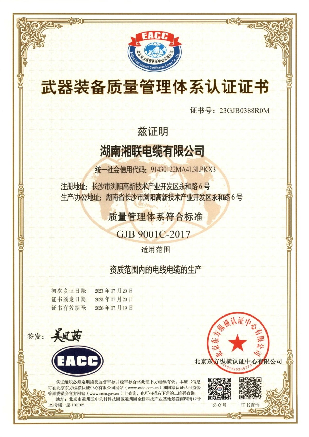 近年來,湘聯電纜始終以“質量是發展的基石,是客戶信任的唯一理由”的質量方針為導向,逐步建立了高標準質量管理體系。從采購、生產、檢測等方面實施全方位質量把控,落實各方面質量責任,實現全過程質量追溯。做到最大限度消除質量隱患,產品質量和客戶滿意度不斷提升。公司先后通過國家強制性產品認證(CCC認證)、全國工業生產許可證、“三位一體”管理體系、武器裝備質量管理體系認證,獲評專精特新小巨人企業、企業標準“領跑者”等榮譽,得到業界廣泛認可和贊譽。
